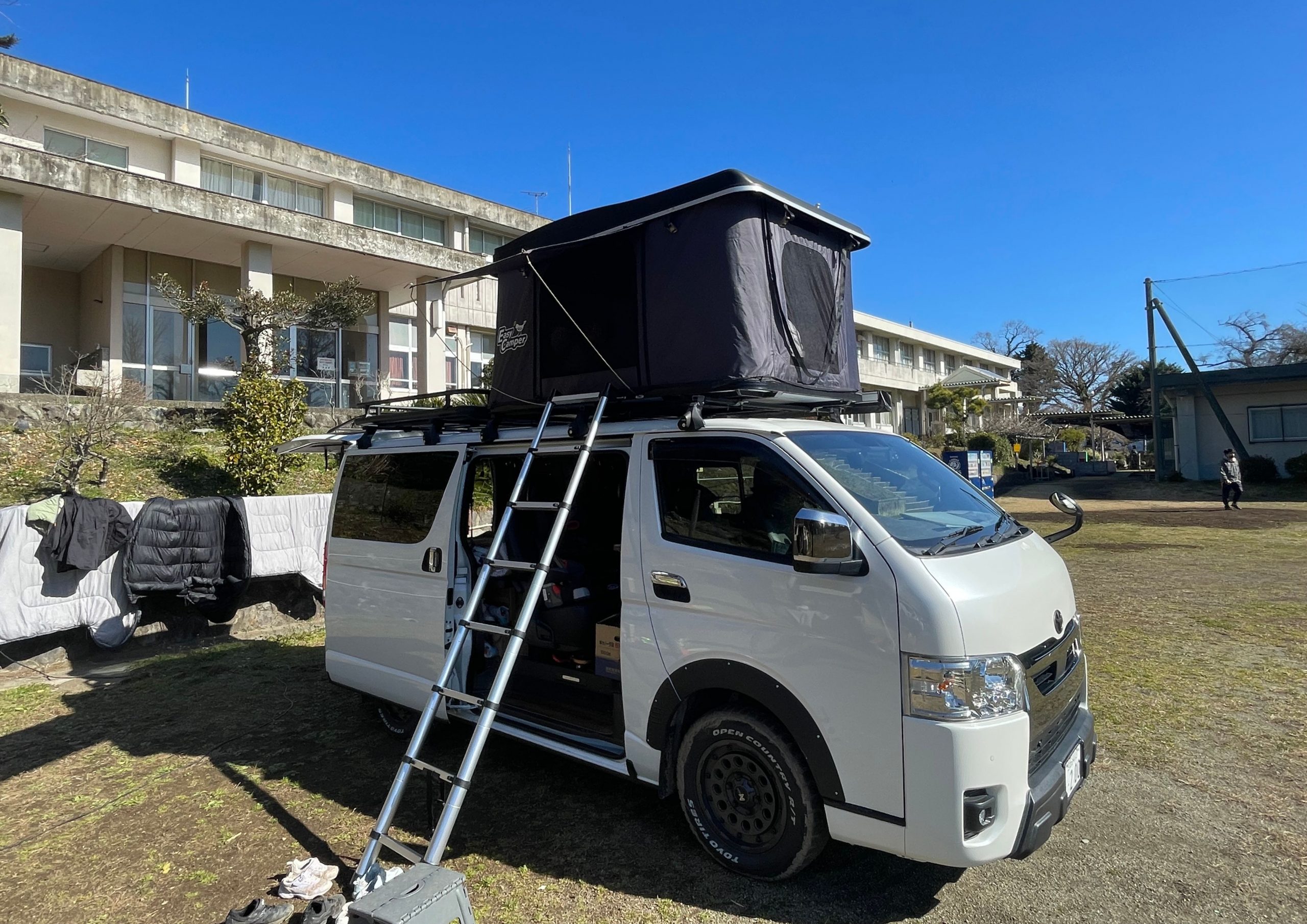 以前はハイエースのナロー(標準ボディタイプ)にルーフテントとキャリアを載せて、海外のオーバーランダースタイルを目指してDIYしていたんです。ブロックタイヤやオーバーフェンダー、ラバースプレーでのブラックアウトなどもしましたが、内装の快適性には限界があって…。しかも憧れて取り付けたUSアンテナは、妻から「何それ!?」と不評でした(笑)。