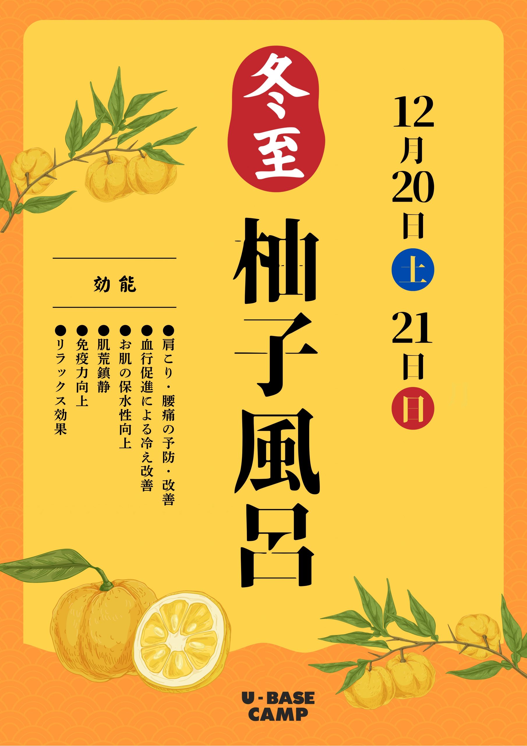U-BASE CAMPの温浴施設は、「冬至」に合わせ12月20日(土)・21日(日)に『柚子風呂』を実施いたします。『柚子風呂』の効果は以下と言われています。